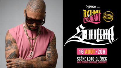 Chaque année, en plus de nos 8 spectacles gratuits, on vous présente un 9e spectacle de très grande envergure avec un artiste qu'on ADORE! Cette année, c'est le rappeur SOULDIA qui sera des nôtres pour ce spectacle incontournable le samedi 16 août.